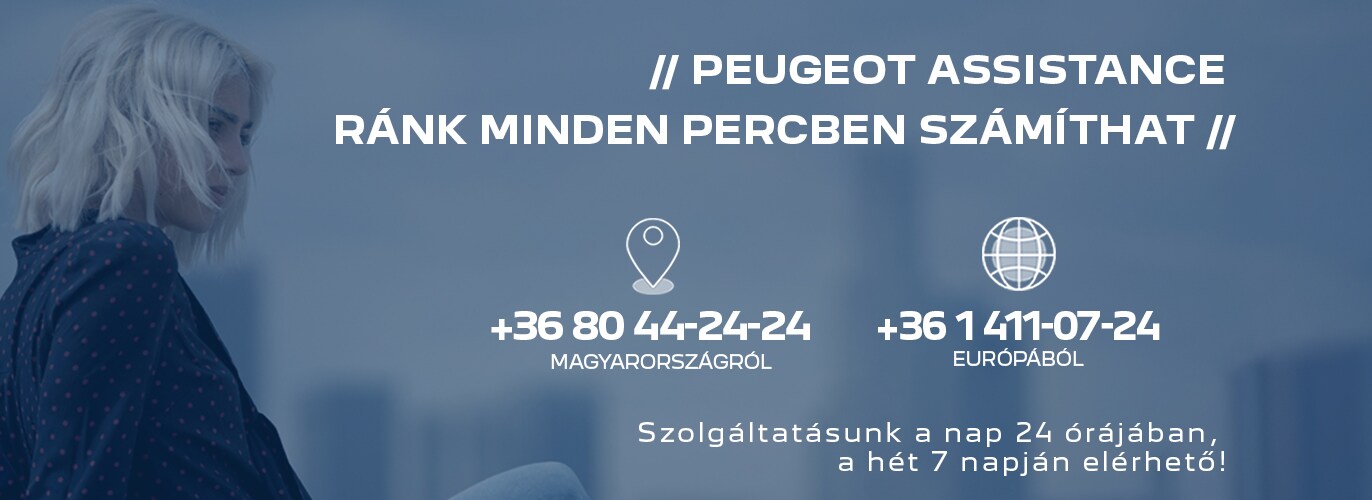 Elakadás esetén hívja azonnal a Peugeot Assistance-t. Szakértelmünknek köszönhetően, mi vagyunk azok, akik a lehető leghamarabb megoldhatjuk a problémát. Átvállaljuk a gyors helyszíni javítás vagy a szervizbe szálllítás gondját a legközelebbi hivatalos Peugeot márkaszervizbe (maximum 100 km-es körzethatárig). Amennyiben a garanciális hiba 2 órán belül nem javítható, úgy márkaszervize mobilitási megoldást ajánl Önnek, hogy útját zavartalanul folytathathassa.